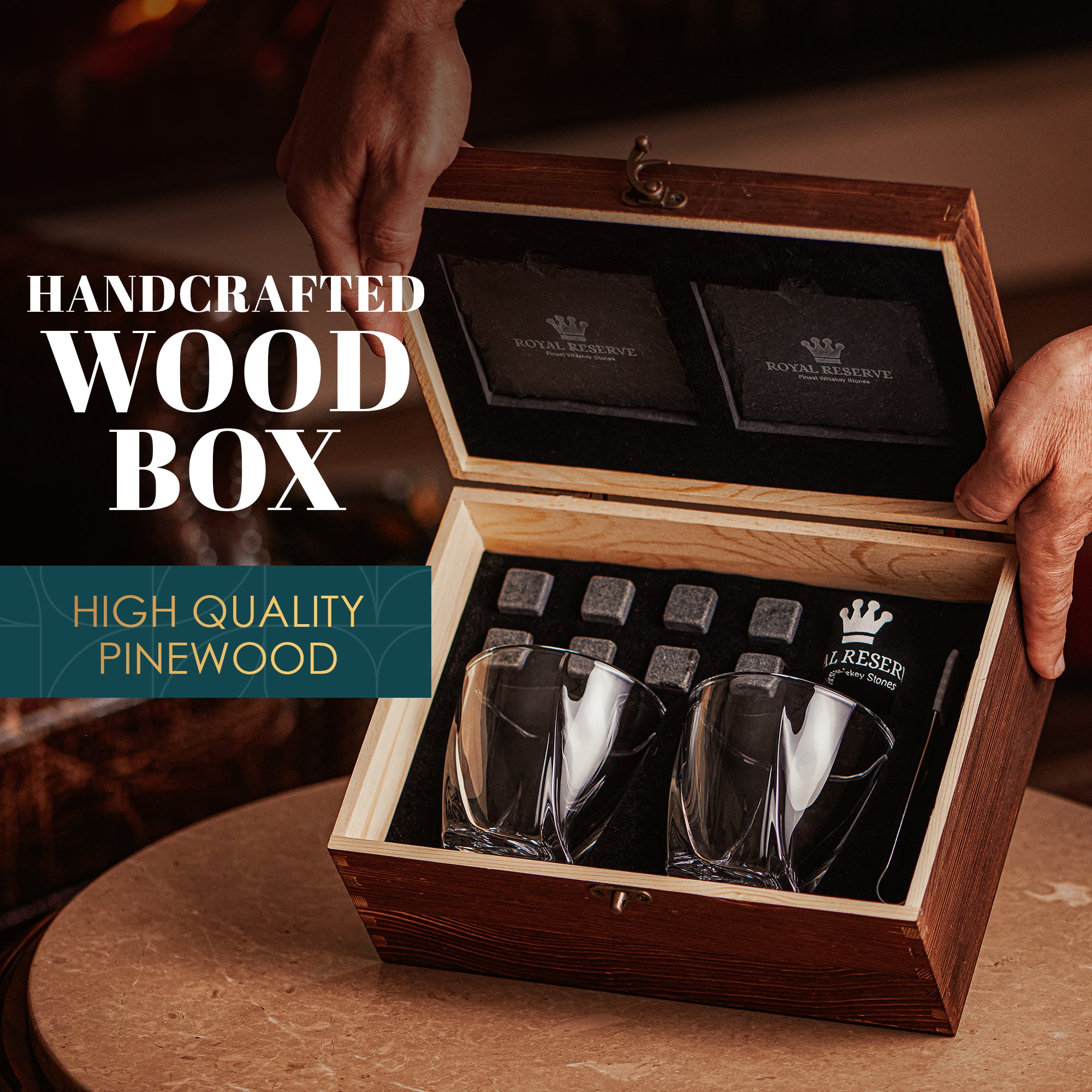 ♛ CLEAR WINNER OVER ICE – Royal Reserve’s whiskey rocks are made of 100% natural granite stones, with a high-tech polishing process that makes them smooth enough not to scratch even the most delicate whiskey tumblers. Our drinking stones are non-porous, tasteless, and odorless. This fancy whiskey kit is handmade, including the handblown old-fashioned cups and wooden box. Excellent present idea for any birthday, friend, boss, cop, guy, male, gentleman, or grandad!