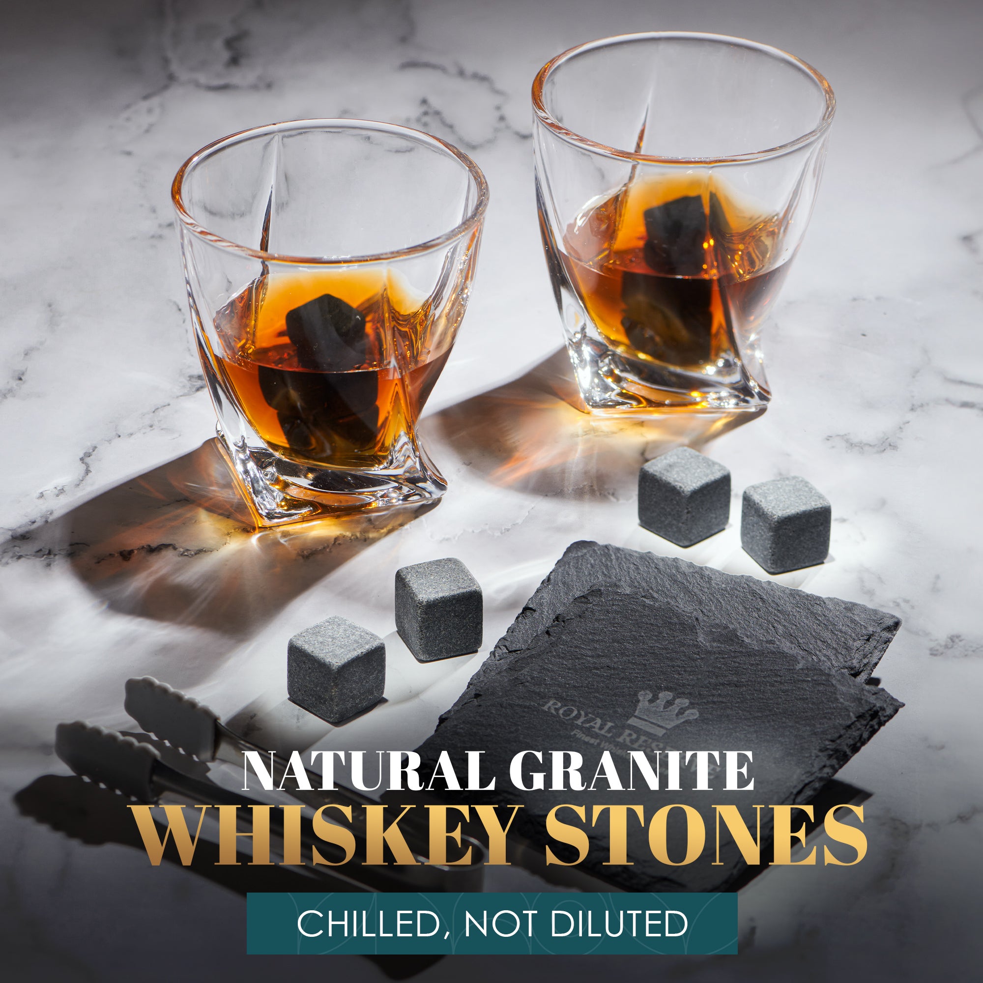 ♛ LEAD-FREE GLASSWARE – Impress your friends and family with Royal Reserve’s beautiful bar stone set. This gorgeous barware set will add an elegant look to any bar display or a man cave. Perfect for cooling gin, vodka, juice, brandy, cognac, rum, cocktail, and any other alcohol or nonalcoholic beverage! Great for housewarming parties, congratulations gifts, man cave stuff, awesome apartment decorations, or for guys who have everything. A true whiskey lover's dream!